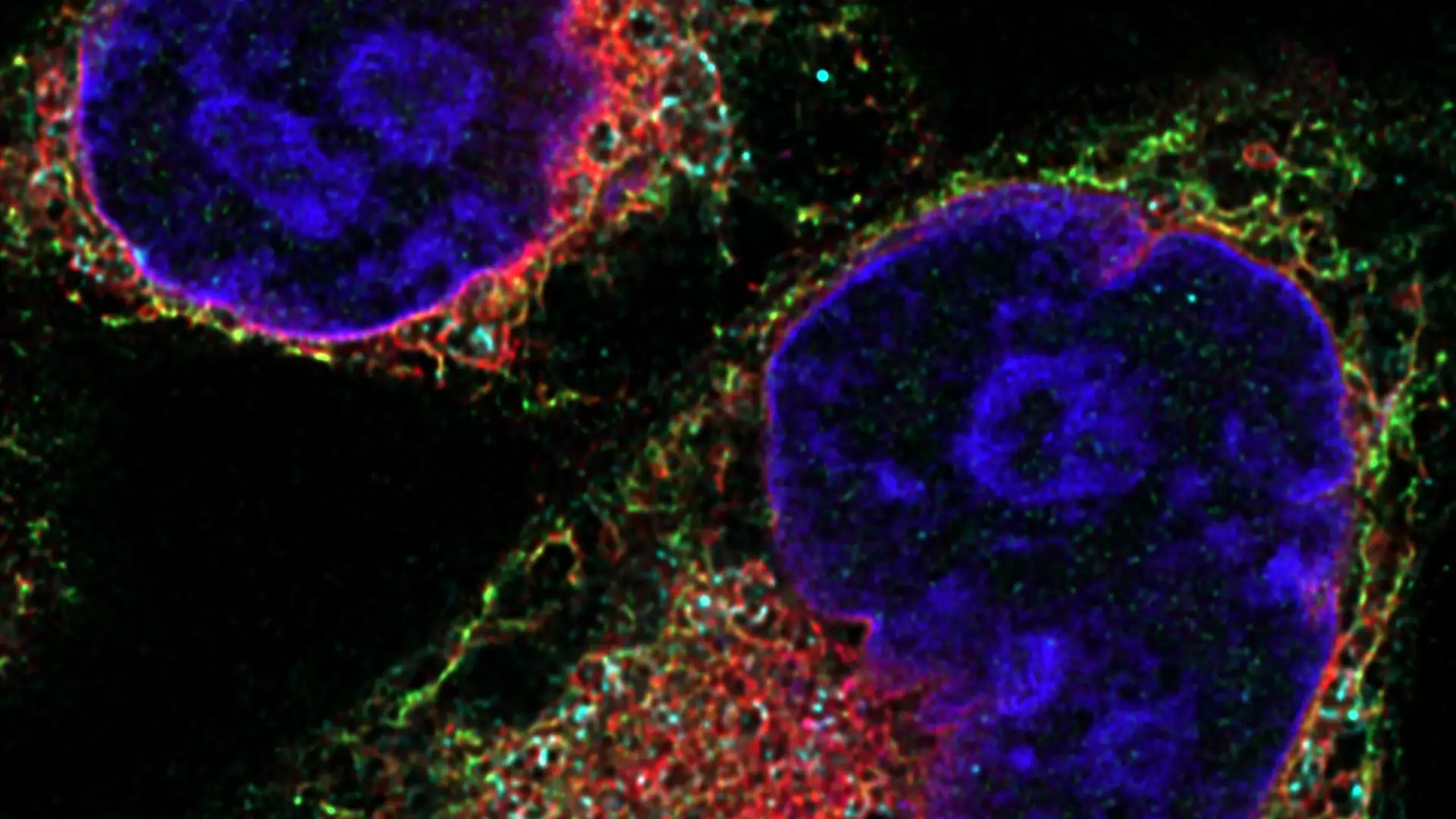string(151) "HeLa cell loaded with multifunctional lipid (red), nucleus (blue), mitochondria (cyan), endoplasmic reticulum (green). Credit: Alix Thomas."